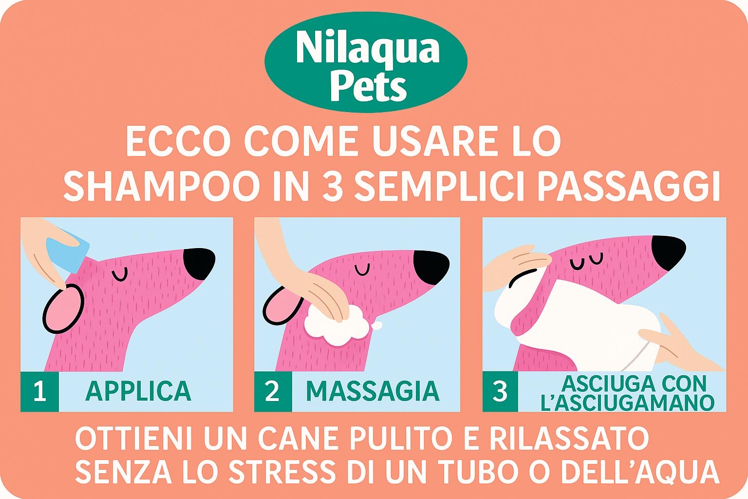 La nostra formula senza acqua rende più facile il bagno: basta applicare, insaponare e passare l'asciugamano! Ideale per una pulizia rapida e per mantenere il manto pulito senza la necessità di un bagno tradizionale.